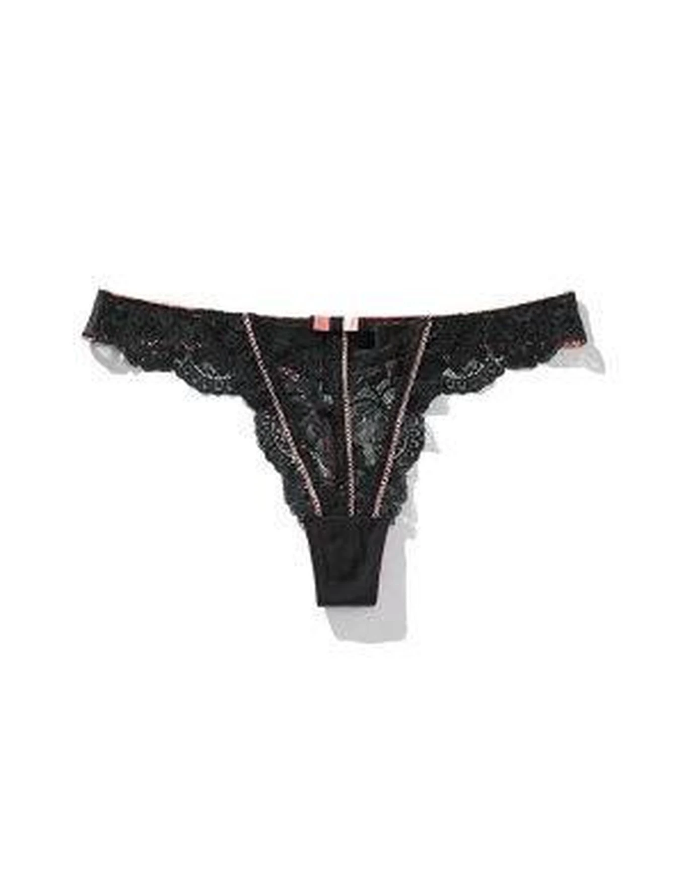 The Adalina thong is a romantic and sexy plus-size style that comes in black lace. This thong features a pretty bow at the waist and Ruffled lace trim at the legs. (Available in plus-sizess M-4X.)