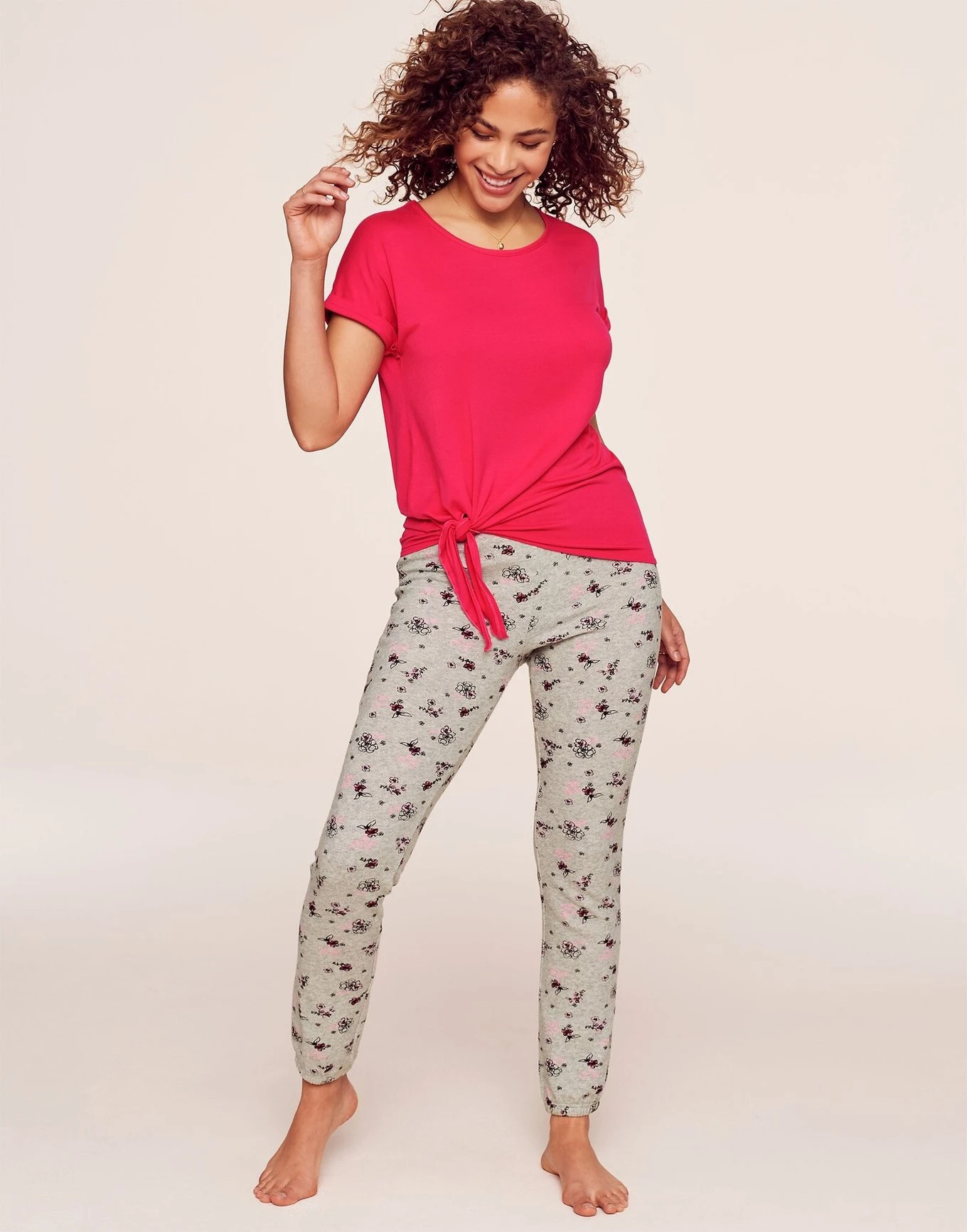 Feelin’ fresh! Give your sleepwear wardrobe an update with this essential PJ set designed for 24/7 lounging. This casual hot-pink T-shirt with a cute draped-knot detail pairs with the comfiest sweatpant sprinkled with rosy florals to put a spring in your step. It’s like this pair was specially handpicked for you. (See Anna Plus for more sizes!)