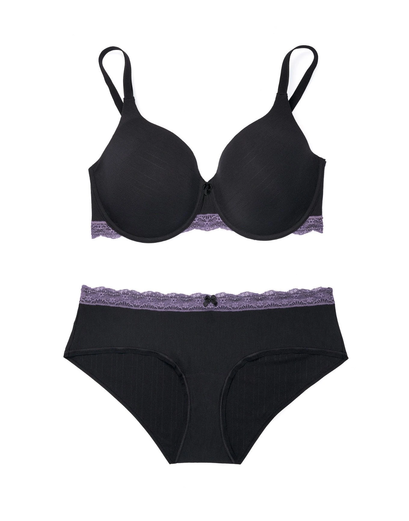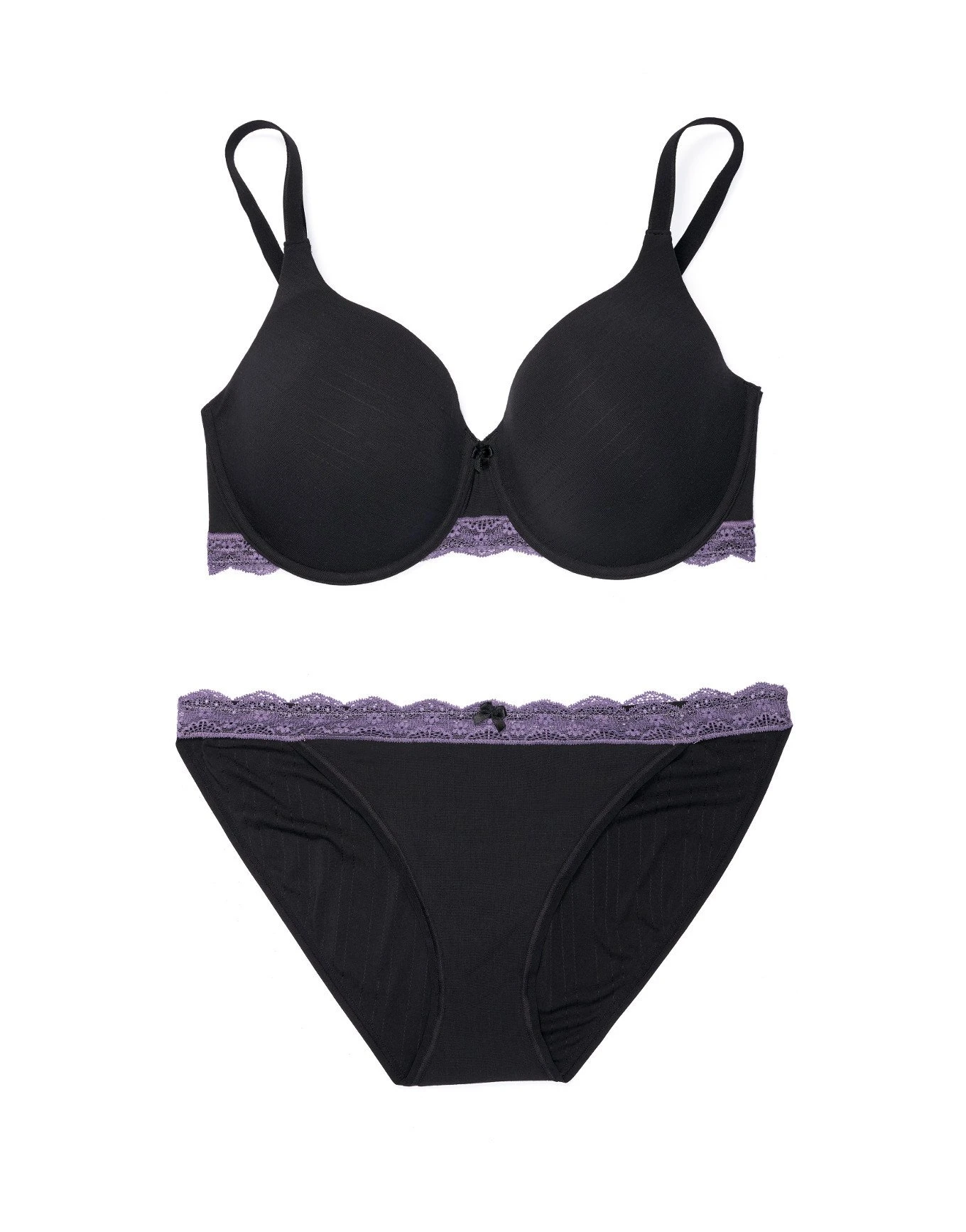 Your classic black bra just got an upgrade with a touch of pretty, purple lace trim. Comfortable, soft fabric and full-coverage cups make Annabelle the bra you’ll want to wear any day of the week. Complete the set with a matching hipster or bikini.