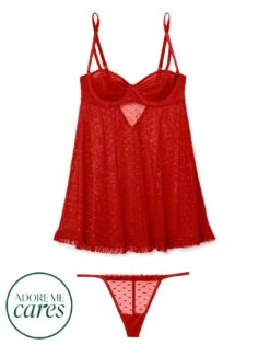 Our Aubrey mesh babydoll dress is perfect for any romantic evening. This red, sheer unlined babydoll features a cut-out and elastic detail on the cups and a full skirt. Pair with the matching g-string panty and you will feel extra flirtatious in no time at all. (Available in sizes XS-XL.)