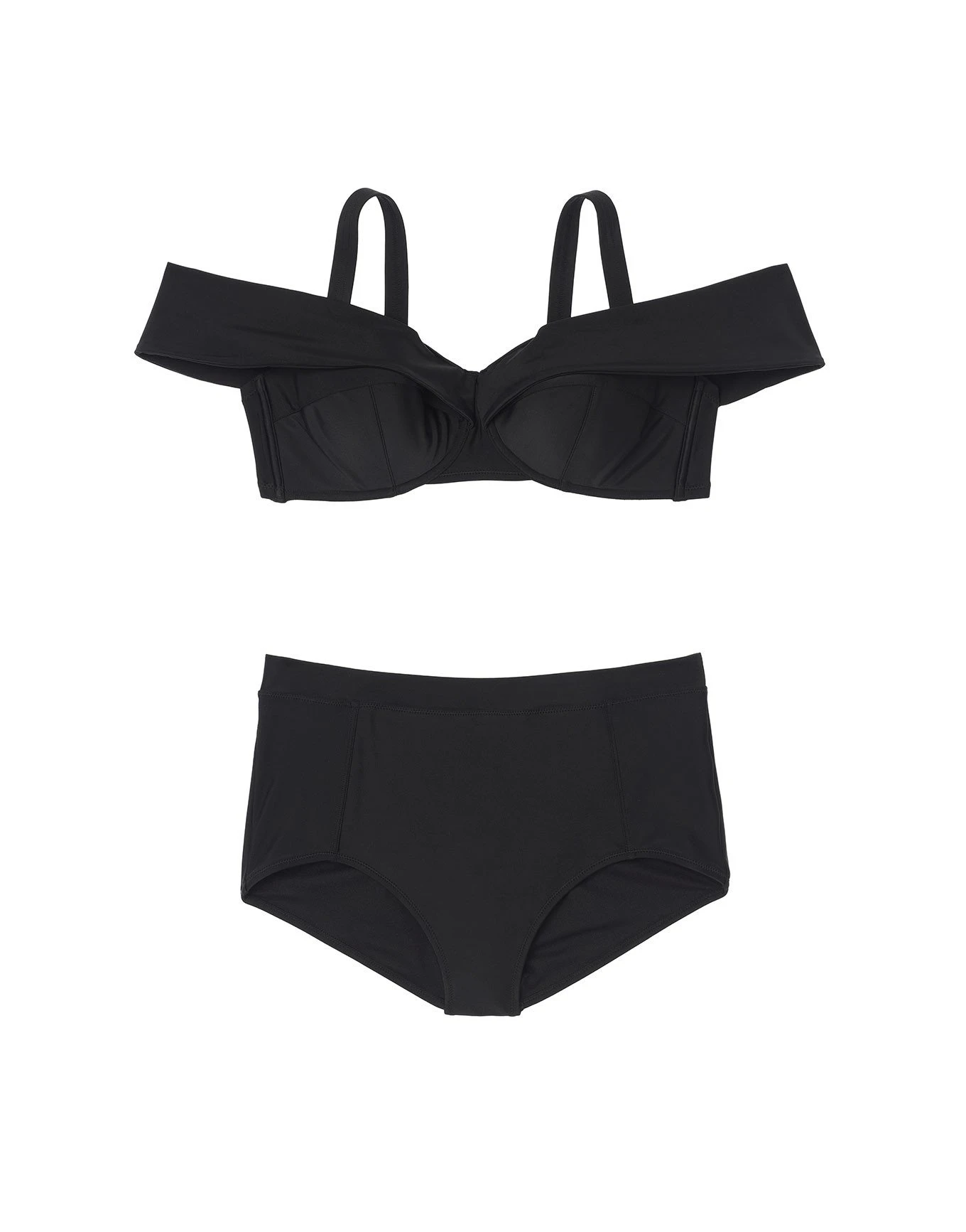 Discover what makes you shine in our jet black Baylie Bikini! The contour bandeau cups are fit to flatter, and feature trendy off-the shoulder straps! This bikini also features adjustable straps and back closure to give you your best fit ever. Comes with a matching high waist bottom.