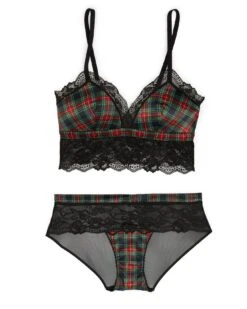 Rock this plaid wireless bralette by itself, or style it for holiday parties! Either way, we’ll keep you in check with our trending Stewart tartan print and longline satin design with a lacy, romantic twist.