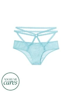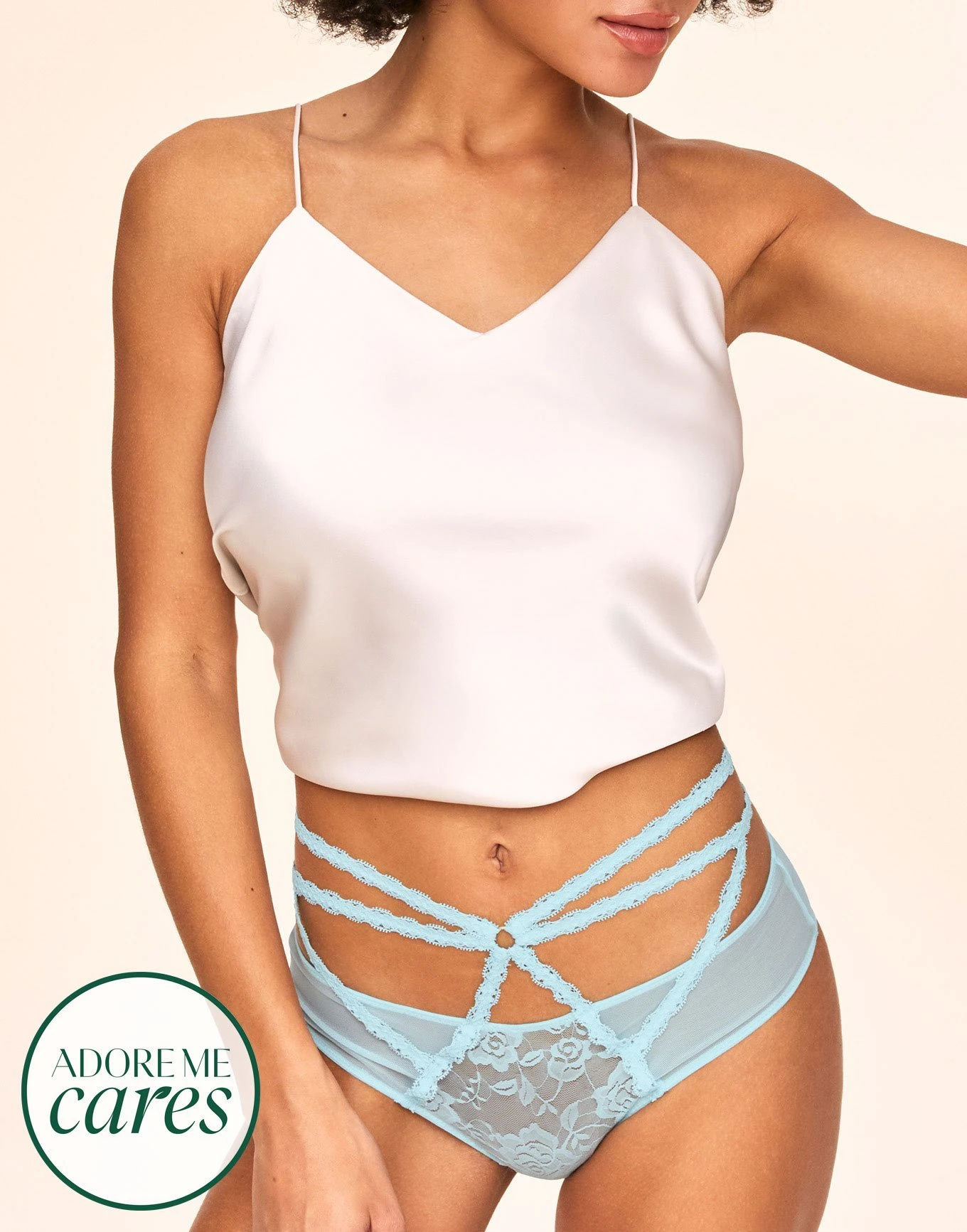 The Brigitte cheeky panty is a great addition to your lingerie collection. This light blue lace panty has a key ring detail in the front, making it both unique and sexy. (Available in sizes XS-XL.)