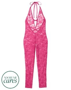 This daring crotchless dark pink catsuit is all about making a statement! It’s crafted from recycled lace for a sustainable sexy look, with a halter neckline that gently ties around the neck. The front and back criss-cross elastic detail adds a touch of playfulness, while the crotch opening ensures a comfortable fit. It’s perfect for boudoir or a special night in (available in size 0X-4X).