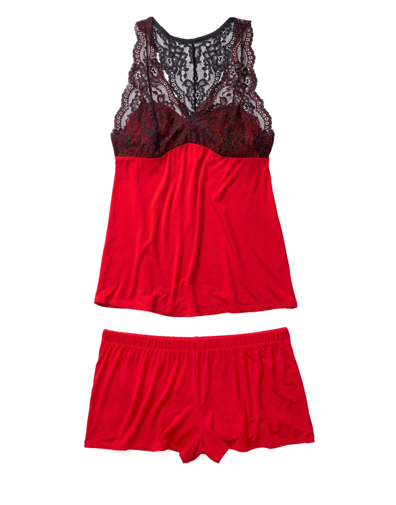 Sexy meets comfort in a flirty red & black PJ set, featuring floral-lace cups and a racerback made to flatter your figure. (If you love this set, you’ll also love the matching slip, Rema!)