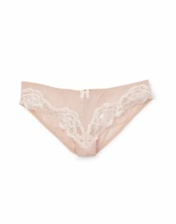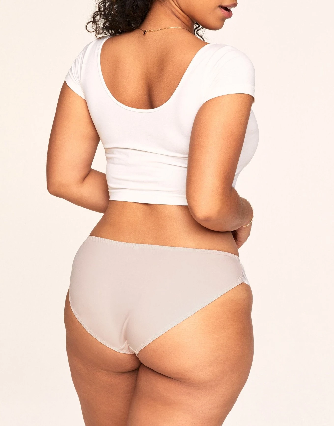These beige satin panties are our new fave for feeling pretty & feminine. The perfect addition to your lingerie collection, they feature a lacy waistband and bow detail. (Available in plus-sizess 0X-L.)