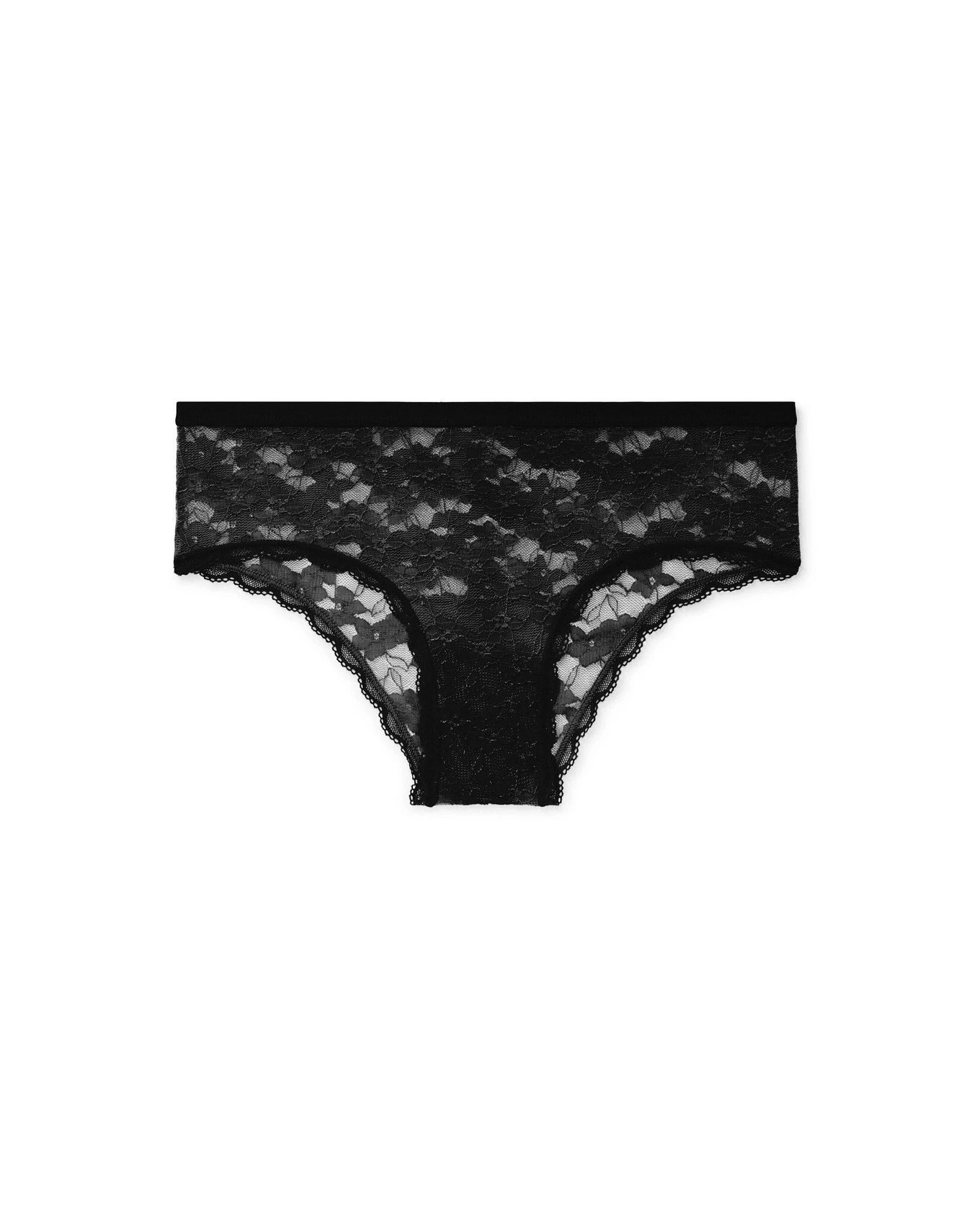 This cheeky black panty is made with allover lace, with a lace trim at the legs. This romantic style panty is comfortable and flattering, with a glimpse of cheeky fun. (Available in sizes XS-XL.)