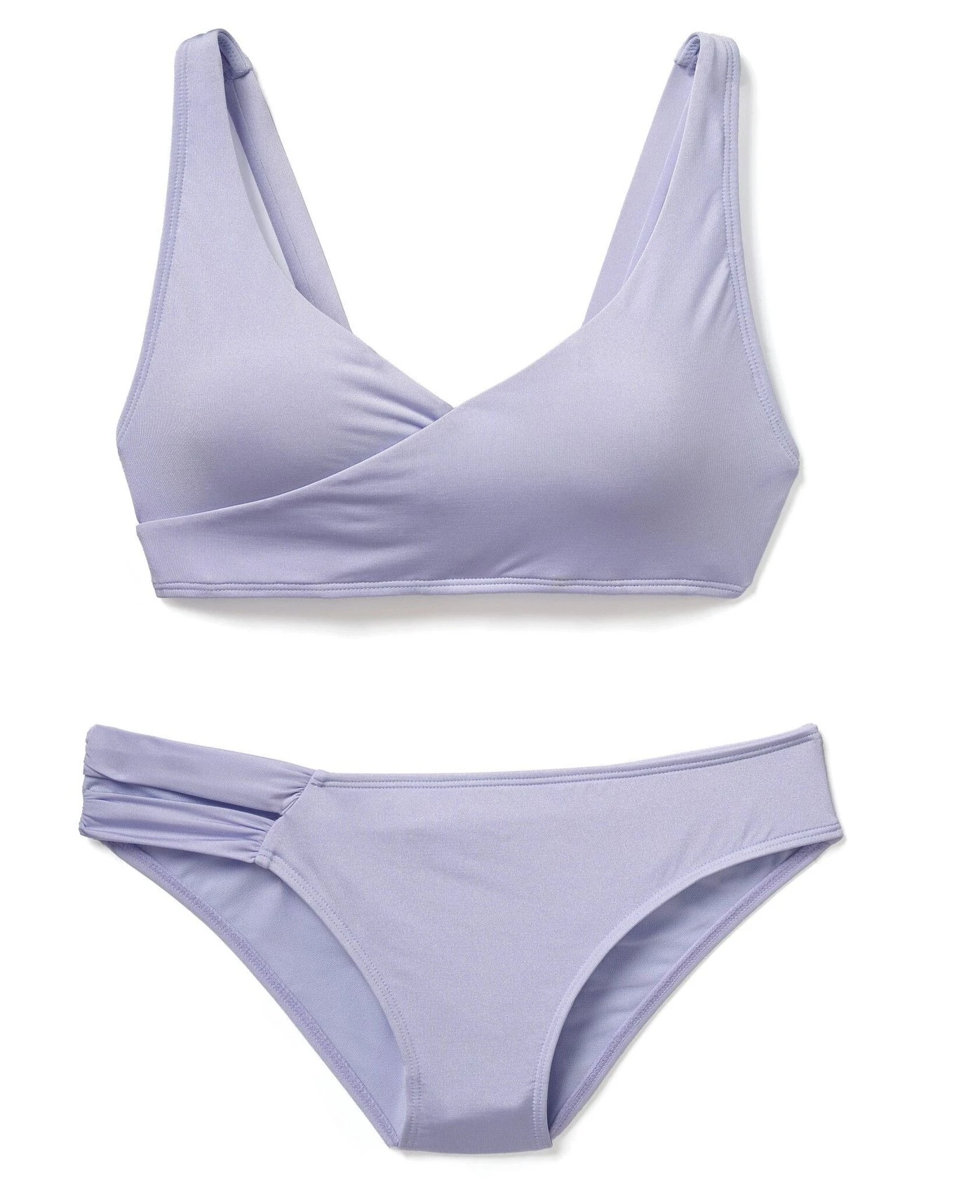 Daydreaming of sunny days and lavender fields, but holding on to the next best thing. Dulce’s soft purple hue will be the sweetest addition to your swim-drawer rotation—and with these supportive triangle cups and adjustable straps, we can’t even pretend to be surprised. Pair this wrap-around top with the matching asymmetrical bikini bottom for a look that’s lovely *and* edgy—all at the same time.