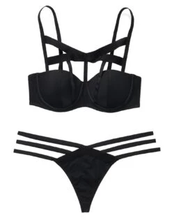 Attention, please! Kiania’s bold black balconette is ready to steal the spotlight with its strappy cage front designed to show off your curves. Pair it with the sexiest matching thong to complete your daring match!