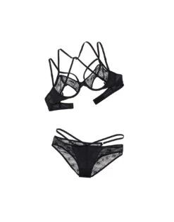 This one-of-a-kind strappy lace bra and matching bikini are not for the faint of heart! Show off your assets in a classy set that embraces the sexiest cut-out details.