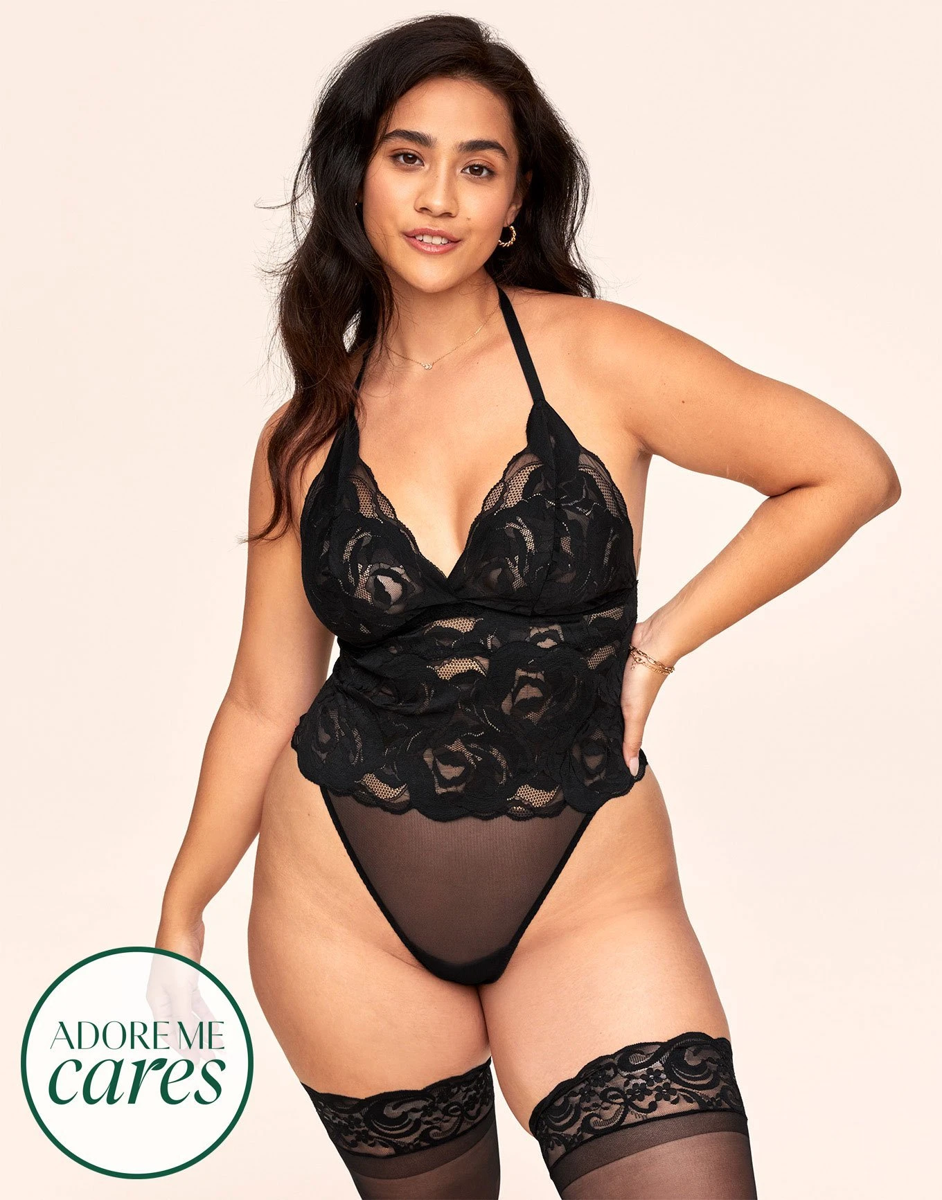Take the plunge with our latest rose-inspired, V-neck halter bodysuit designed with recycled polyester to create some of the comfiest, stretchy lace you’ve ever felt. Seriously, saying goodbye to itchy lingerie (and hello to a smooth, curve-hugging fit!) never felt so good. Pair Esme with our matching Tegan thigh-high stockings for the full look!