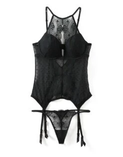 Show off your figure in the show stopping black Heathyr. This gartered bustier will hug your curves in all the right ways with dot mesh and beautiful lace. The open high neck is a jaw dropping detail in lace. With removable pads you’re able to choose the right lift for you! Complete the look with a matching thong.