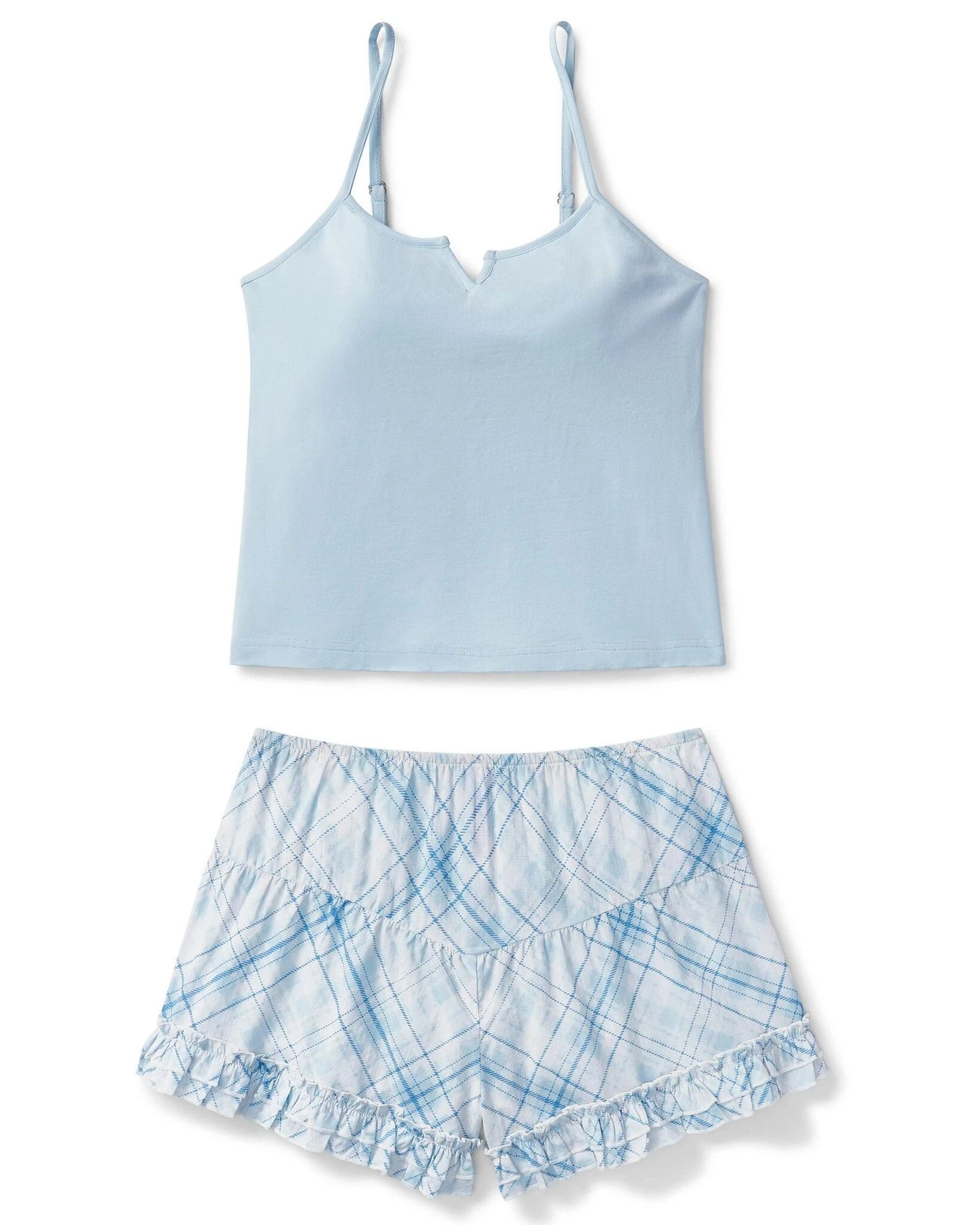 If this lightweight & comfy sleepwear set in baby-blue hues doesn’t make you dream of summer, we don’t know what will. Our comfy knit cami comes with a convenient built-in shelf bra to keep you supported at all times, while the 100%-cotton short designed with flirty ruffles and a picnic-checks print guarantees you’ll always feel both cute & comfy—aka, the best of both worlds.
