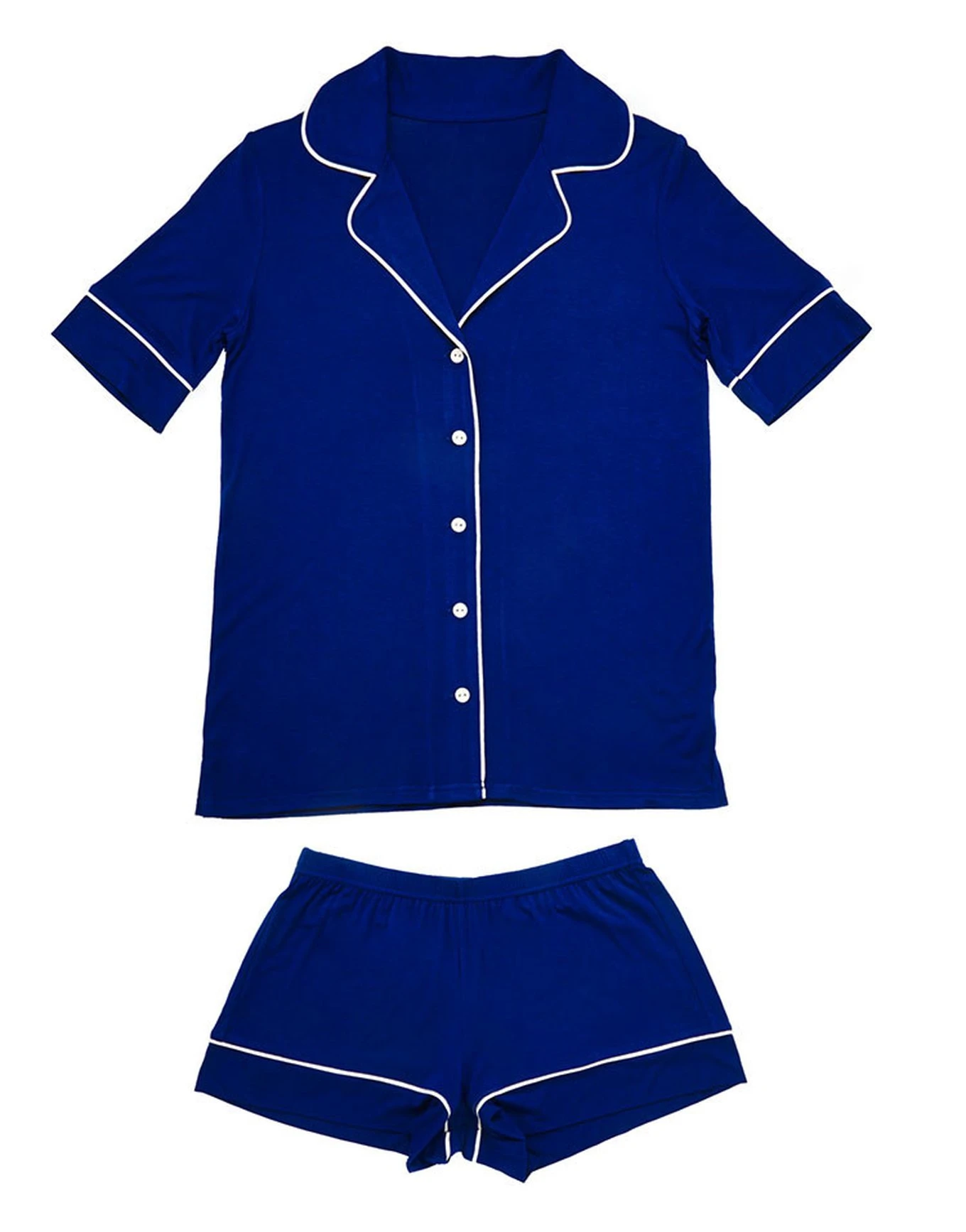 Our menswear-inspired Jayne is timeless in sophisticated blue. This short sleeved pajama top and short set features satin piping and a classic notched collar. The short has an enclosed elastic waist and a flattering fit.