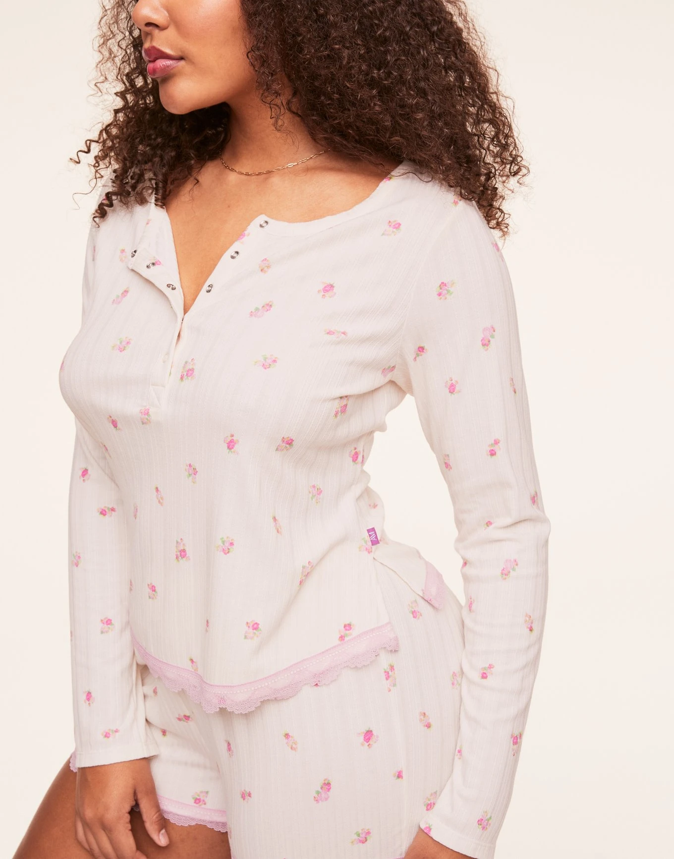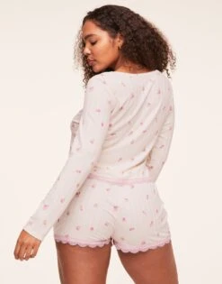 This flirty and fun long sleeve henley and shorts set will keep you comfortable all night long. The set features a soft jacquard rib and functional snaps for a relaxed and easy fit. The set also includes matching shorts with lace trim. (Available in plus-size 0X-4X).