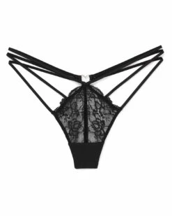 This black Brazilian thong is both cheeky and romantic with its bold strappy sides and lace front. A single heart hangs from the back, adding a playful touch to this otherwise sexy lace thong. (Available in sizes XS-XL.)