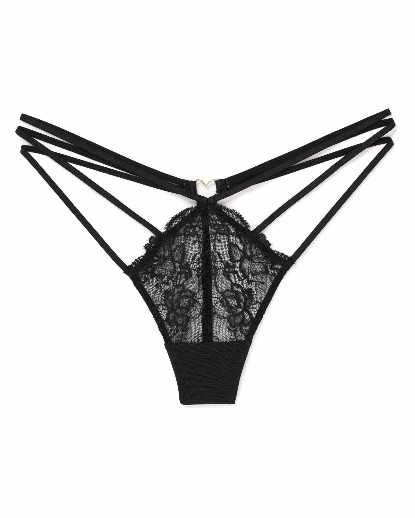 This Brazilian thong panty is made with a super soft and stretchy lace that hugs your curves. With a strappy side detail and heart hardware in back, this black thong is both sexy and playful. (Available in plus-sizes 0X-4X.)