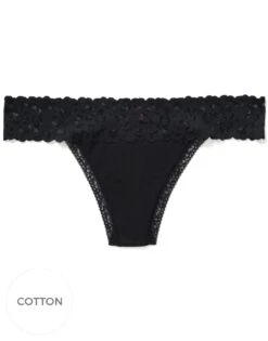 Black lace thong panties that are so comfortable, you’ll forget you’re wearing them! These hipster panties are made from soft cotton-jersey with stretch for a perfect fit, and feature pretty lace trim around the waist and legs. (Available in sizes XS-XL.)