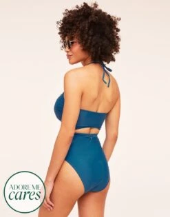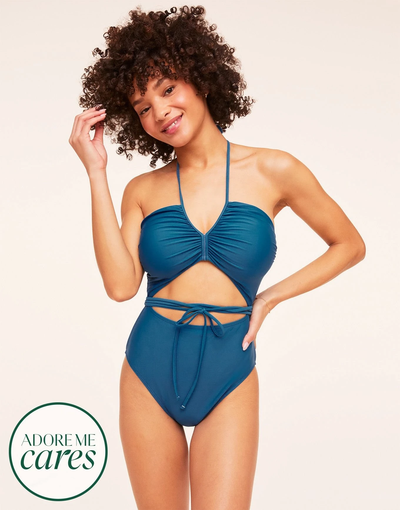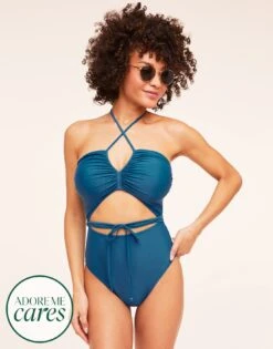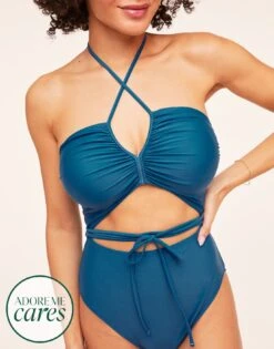 This striking knit dark blue one-piece is perfect for a day on the water. With ruched details, sexy cutouts, and a halter tie closure, this swimsuit is comfortable and totally hot. (Available in sizes XS-XL.)