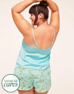 The Linny light blue PJ set features a satin cami with lace along the neckline and whimsical printed shorts with a tulip hem and an elasticated waistband for a perfect fit. This set is soft, romantic, and perfect for spring. (Available in plus-sizes 0X-4X.)