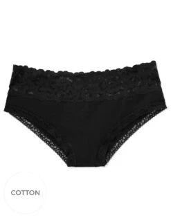 These cheeky panties are made from super-soft cotton jersey with a touch of stretch for the perfect fit. The black cotton panties are trimmed with lace around the waist and legs for a feminine touch. (Available in sizes XS-XL.)