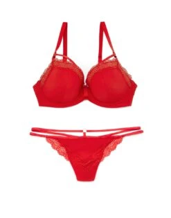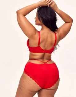 Matching hipster or thong panty with lace trim and satin strappy details