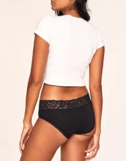 These hipster panties come in a pack of three and are made with a soft and stretchy cotton-jersey fabrication. They feature pretty lace trim around the waist and legs and come in black, evening blue, and mauve mist. (Available in sizes XS-XL.)