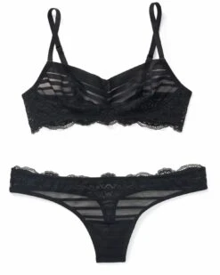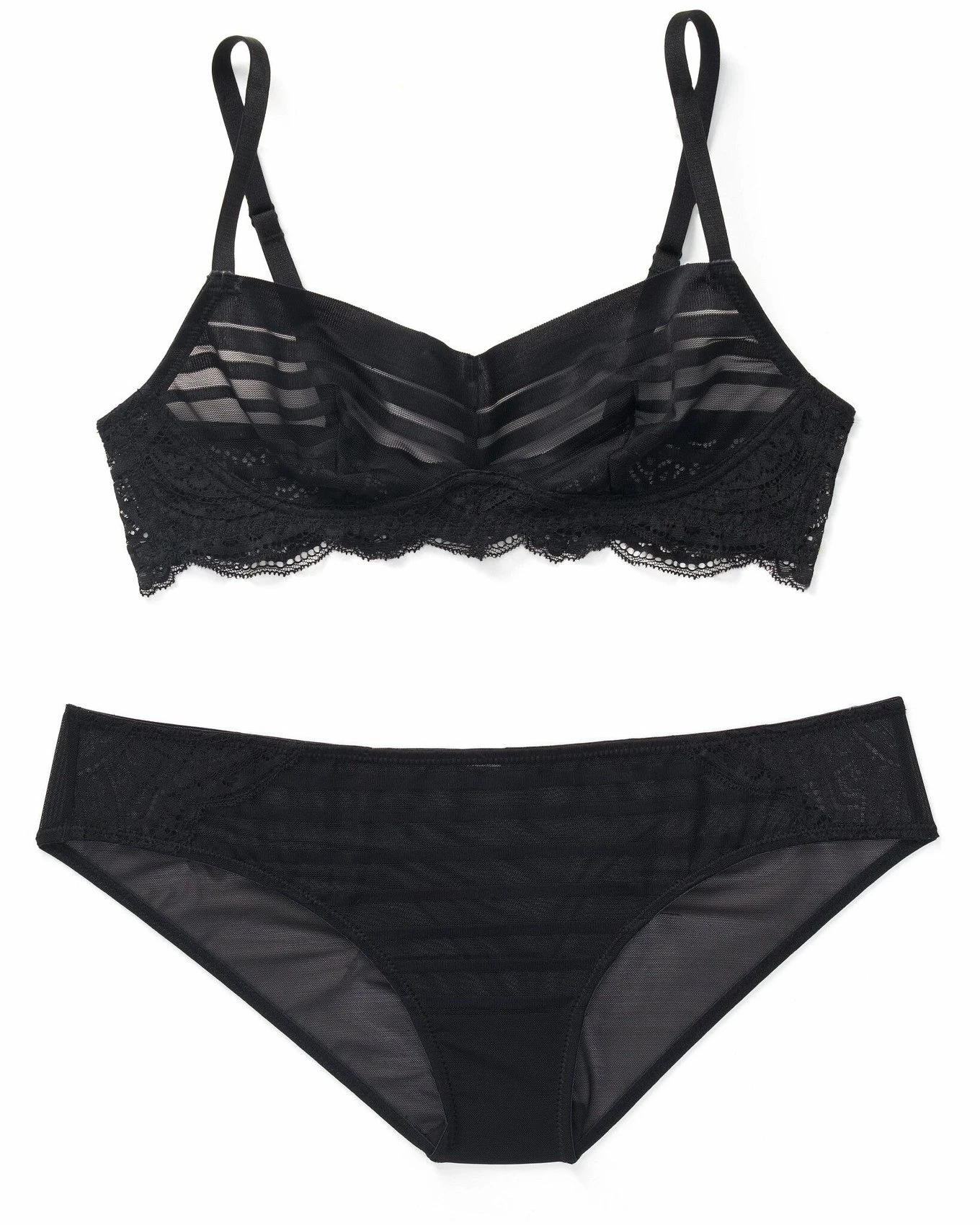 Sheer delight! This easy, breezy staple—made of sheer stripes and accented with pretty lace on the edges & back—is an essential wireless bra paired with a matching bikini or thong. Perfect to transition from summer to fall or pair with your fave all-black outfits!