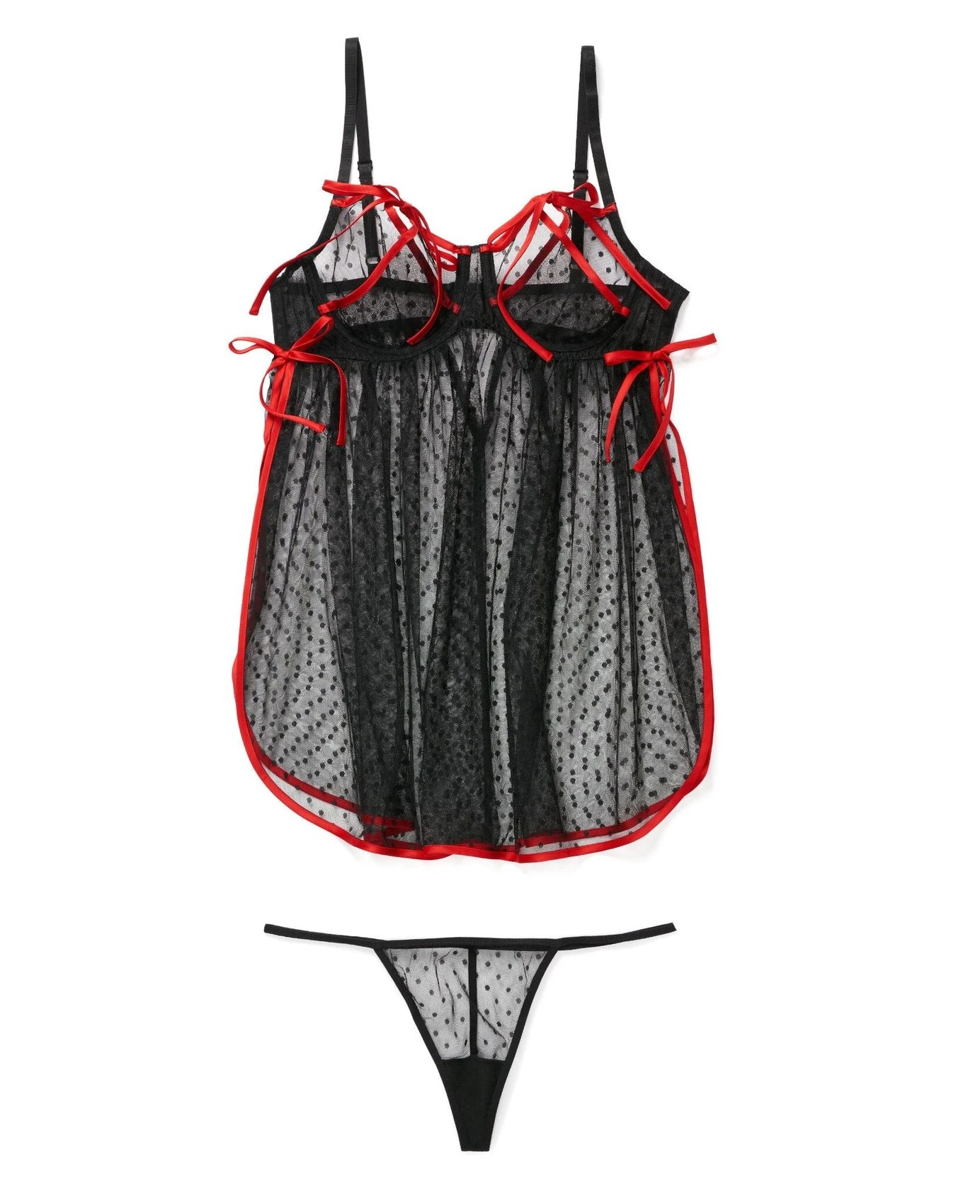 Why hold back when you can go all out? Amp things up for Valentine’s Day in this sheer boudoir babydoll in bold black & red. Featuring sexy cut-outs cups that tie (or completely untie!), playful flyaway sides, and a matching G-string underneath, Noemi is bound to make sparks fly and flatter you in all the right places. (See Noemi Unlined Plus for more sizes!)