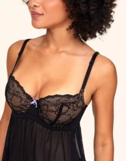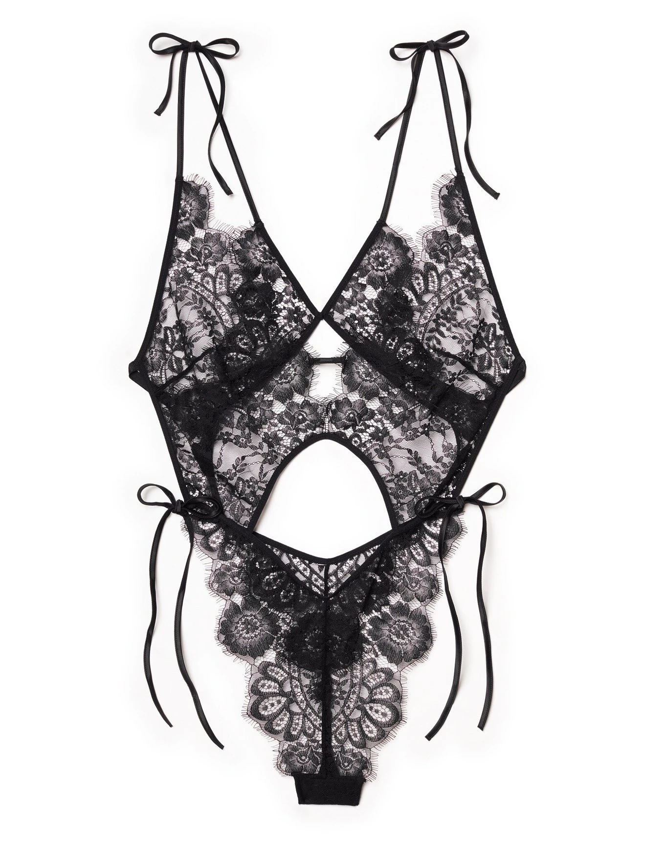 Glam and bold, this lace bodysuit has a plunging neckline and a dramatic plunge back. With functional side ties at the waistline and butterfly straps, this black lingerie is ready for anything. (Available in sizes XS-XL.)